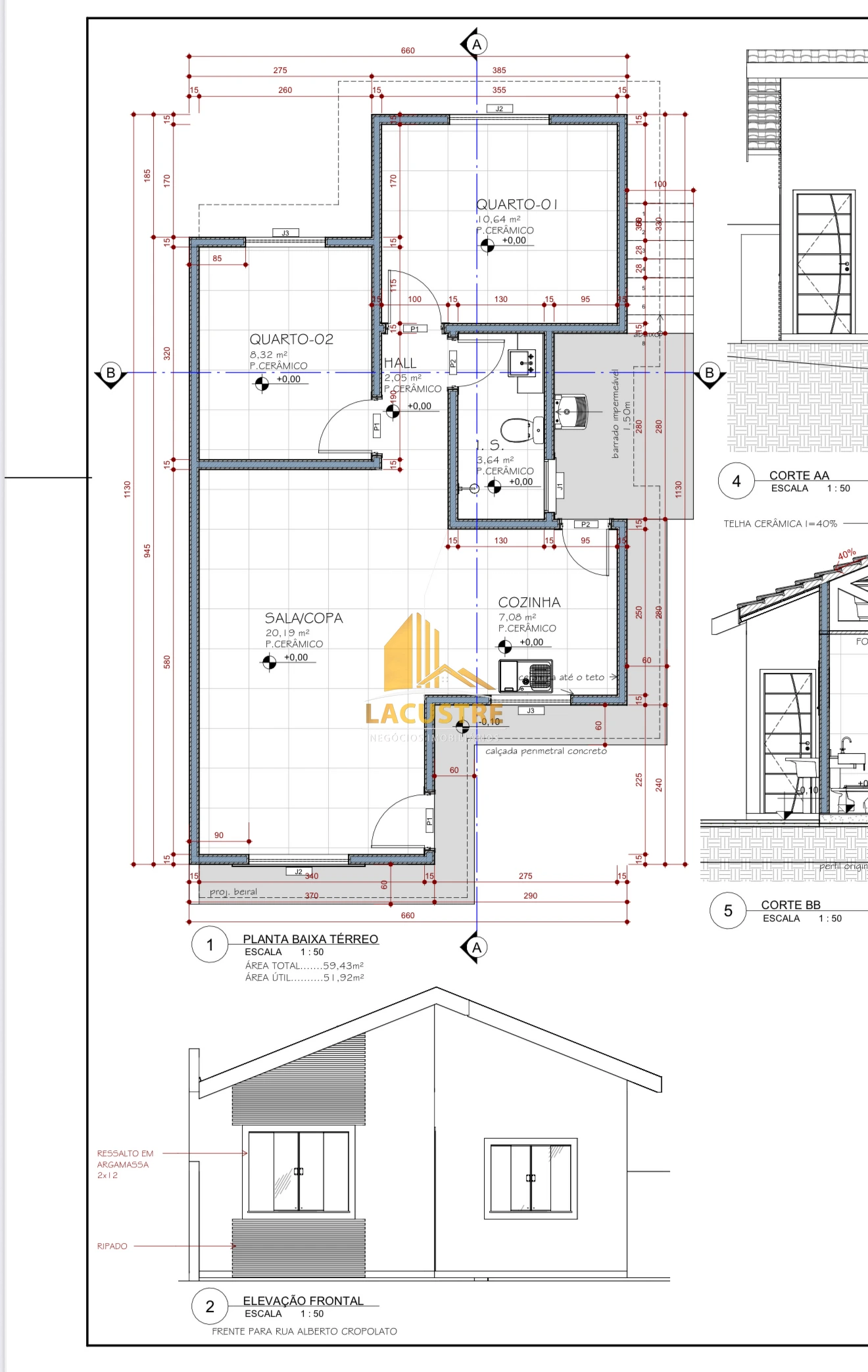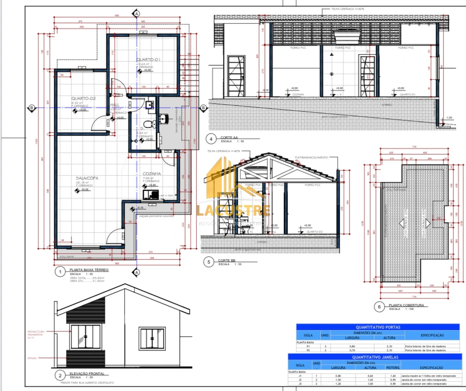 Essa residência contém 02 quartos, 01 banheiro social, área de serviço, cozinha e sala conjugada com a copa.